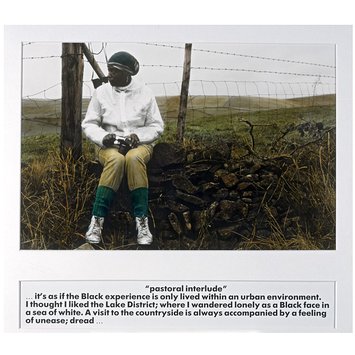 Pollard’s pose likewise unsettles. Sitting on a dry stone wall, knees bent inwards, her posture, and her clothes, are identical to any female rambler. However, her very dark skin contrasts with the white coat, her headscarf bulges as if hiding dreadlocks, and again the familiar is unsettled, something that is echoed in the text: we feel Pollard’s unease.