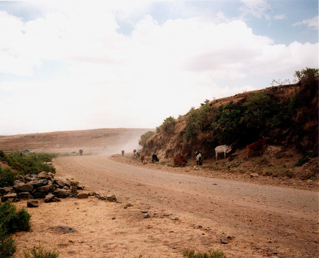 The collection demonstrates a sameness to landscapes which allows the viewer to consider their distinctiveness by, effectively, placing them side by side. Here, both compositions are similar. But the colours, the sky, the cattle, dust – and lack of it, metalled surface – and lack of it – sharply delineate the economic power which makes a leisure trip to the South Downs, from the lack of it which is evidenced by the subsistence farming of Ethiopia.