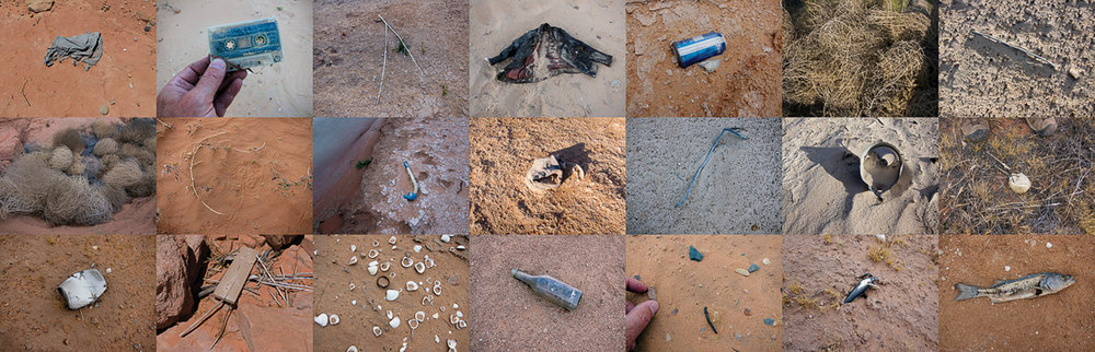 Unlike the standard essay-then-images of Porter’s work, Solnit’s essay flows through the images, creating a dialogue with them, providing the contexts of climate change, critiquing Porter, but also revelling in the experience of being out exploring. There being a notable lack of prominent female ‘landscape’ photographers, having a female voice is part of the strength of the project. Both images and text situate the collaborators throughout the work, and this enhanced subjectivity, and that this is a collaboration both disrupt the individualistic vision of The Place No-one Knew. In doing this, the viewer is encouraged to develop their own relationship with the place; the observers are in this way part of what the viewer is able to observe, rather than Porter’s direct communication of a unique viewpoint. This engagement helps develop agency, and an active viewer is more likely to feel prompted to act than a passive one. The socio-political and historic context of place is also communicated through the images, though without didacticism. Hence litter, cracked mud and vapour trails are stark reminders of environmental destruction, while abandoned picnic tables, boats and closure signage remind of the cost of the receding waters to local communities. In this way, the viewer gets the impression of being a fellow traveller to the leading edge of catastrophic climate change and the novel landscapes it is already creating.