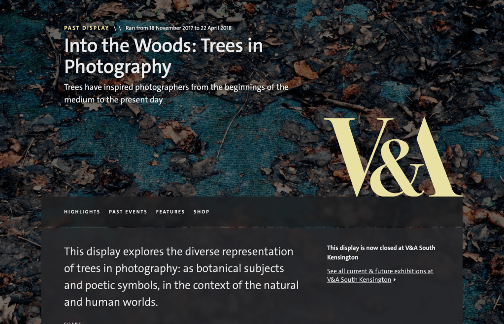 Into the Woods: Trees in Photography was a small exhibition at the Victoria & Albert Museum which opened in late 2017. It contained the work of 40 photographers from throughout the history of photography, some chosen from the V&A archives, others from those of the RPS. Photographers included Crystal Lebas, Abbas Kairostami, Stephen Shore, Alfred Steiglitz, Alvin Langdon Coburn, Mitch Epstein, Paul Strand, Robert Frank, Henri Cartier-Bresson, Edward Steichen, Wolfgang Tilmans, Lee Friedlander, Jean-Eugen-Auguste Atget, Jem Southam, Simone Nieweg, Paul Hart, John Davies, Robert Adams, Ansel Adams, Ingrid Pollard, Paul Hart, Paul Hill and Fay Godwin.