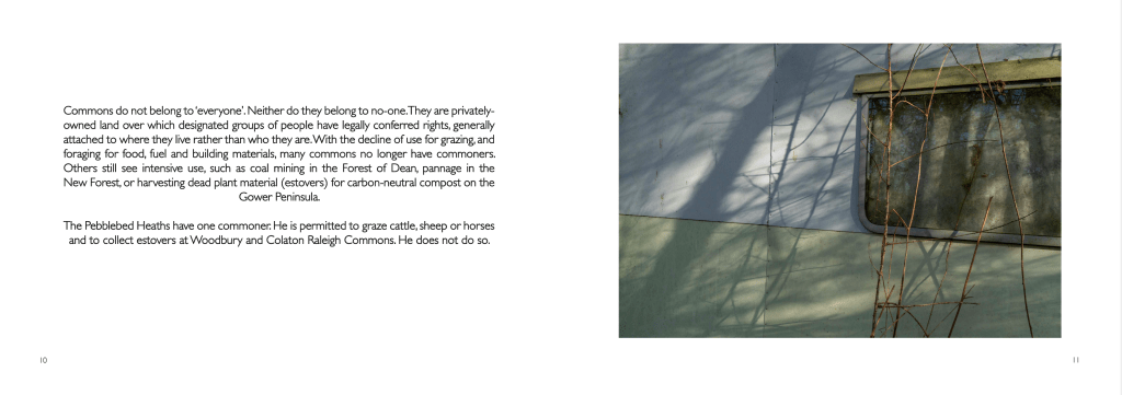 It was also my approach in creating common knowledge, weaving together ‘knowledge’ gleaned from conversations and readings alongside images gleaned from a series of occasionally directionless and impulsive photo walks across the Pebblebed Heaths, and drawing this together with personal observation and speculation. From this, I have drawn together the themes of the portfolio, the subthemes of each double spread, and the main themes – historical context, changing landscapes, working together. The problematic objectivity and vagueness implicit in the title is entirely deliberate, as is the occasionally tenuous connection between text and image. Does the heath’s one commoner really live in a run-down caravan? Is that graffiti really on a military bunker?