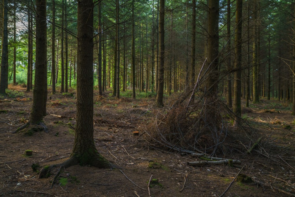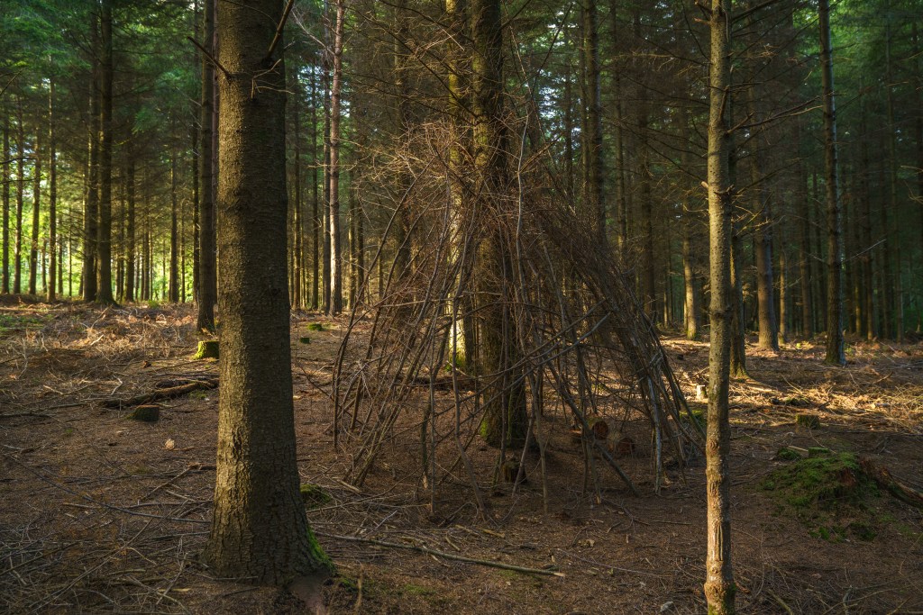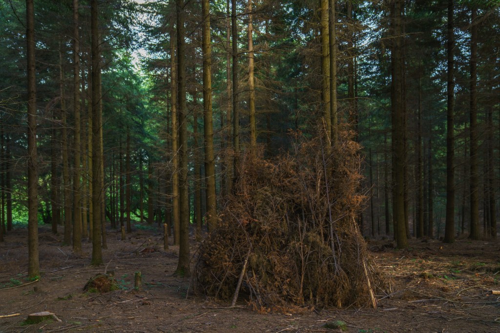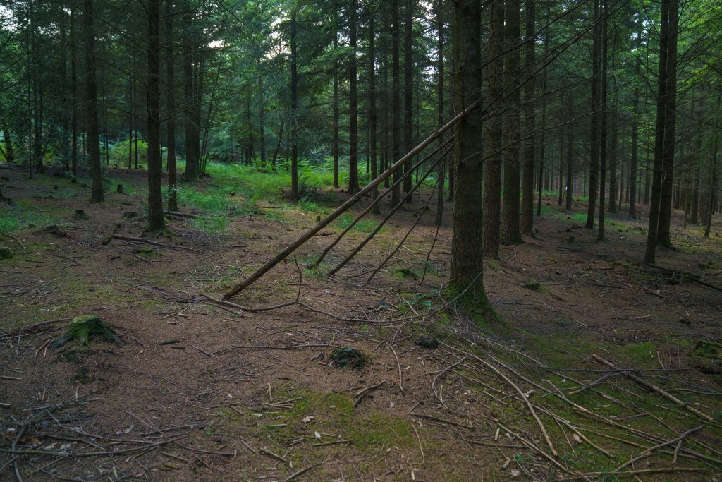 The timing of reading Tuan’s work is fortuitous, as I’m focussing on a more determinedly subjective response to the Pebblebed Heaths during this module, in preparation for exploring the subjective responses of others. Previously, I had let myself be open to and informed by the Heaths, when photographing, in social encounters, and through research. Now, however, I’m more interested in my own responses and, particularly, how I am constituting places and choosing places according to my own needs. I have mentioned previously my turn to the melancholy, but I believe the environments I seek out also provide psychological benefits; there is something reassuring in being enclosed by trees in some of the dense woodland, just as the emptiness of the plantations at the end of the day provides not just solitude but a privacy not possible on the heaths. I am aware of such places as being pre-made as such – enclosure banks, naming on maps, the prevalence of dens and trail adaptations – but I am also drawing on this material to constitute the place for myself, after my own fashion.