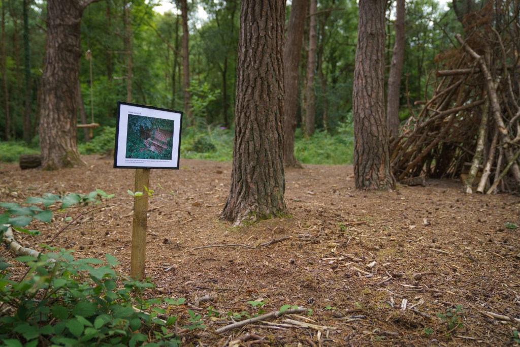 Third, the trail took its place amongst the events of the common. The Royal Marines have been training in exactly this corner or the commons throughout the exhibition, and this has meant that one image, close by a spot favoured for boozy campfires by local teens, has remained pristine and spotless, a series of makeshift shelters being made and remade nearby. Meanwhile another image, housed in a former military hut, was the favoured dumping ground for a particular dog walker’s filled dog-poo bags, and the same place was used to dump Costa Coffee cups (presumably the same person). This has continued throughout the exhibition.